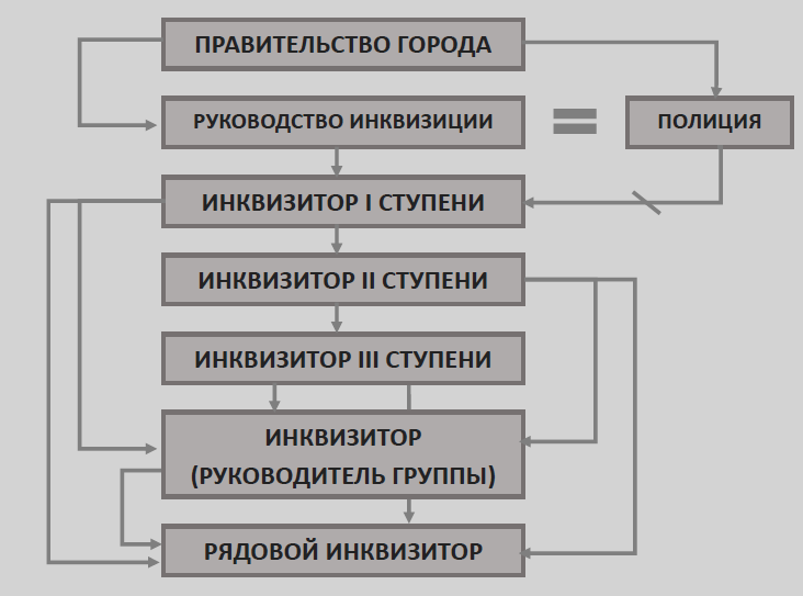 [indent] Легализация организации "Инквизиция" требовала от руководства четкой структуры и иерархии. После ряда переговоров была утверждена следующая иерархия: правительство города (в лице мэра и его команды) устанавливает власть над руководством инквизиции и берет на себя большую часть расходов на содержание каждого отдельного члена организации (сюда входит еда, вода, жилье в случае необходимости, базовое покрытие досуга, экипировка и снаряжение, средства связи). Руководству инквизиции подчиняется вся организация, начиная инквизитором первой ступени и заканчивая рядовыми инквизиторами и стажерами. Инквизитор третьей ступени подчиняется инквизитору второй и первой ступени, инквизитор второй ступени подчиняется инквизитору первой ступени. Все они подчиняются высшему руководству. Инквизитор каждой ступени контролирует руководителей групп инквизиторов (за каждым из них закреплена своя, однако в равной степени каждому инквизитору-столпу подчиняются все группы). Инквизитор-руководитель группы имеет в подчинении группу рядовых инквизиторов. Рядовой инквизитор подчиняется только своему руководителю и вышестоящим. Руководитель группы А не может контролировать деятельность группы Б. |